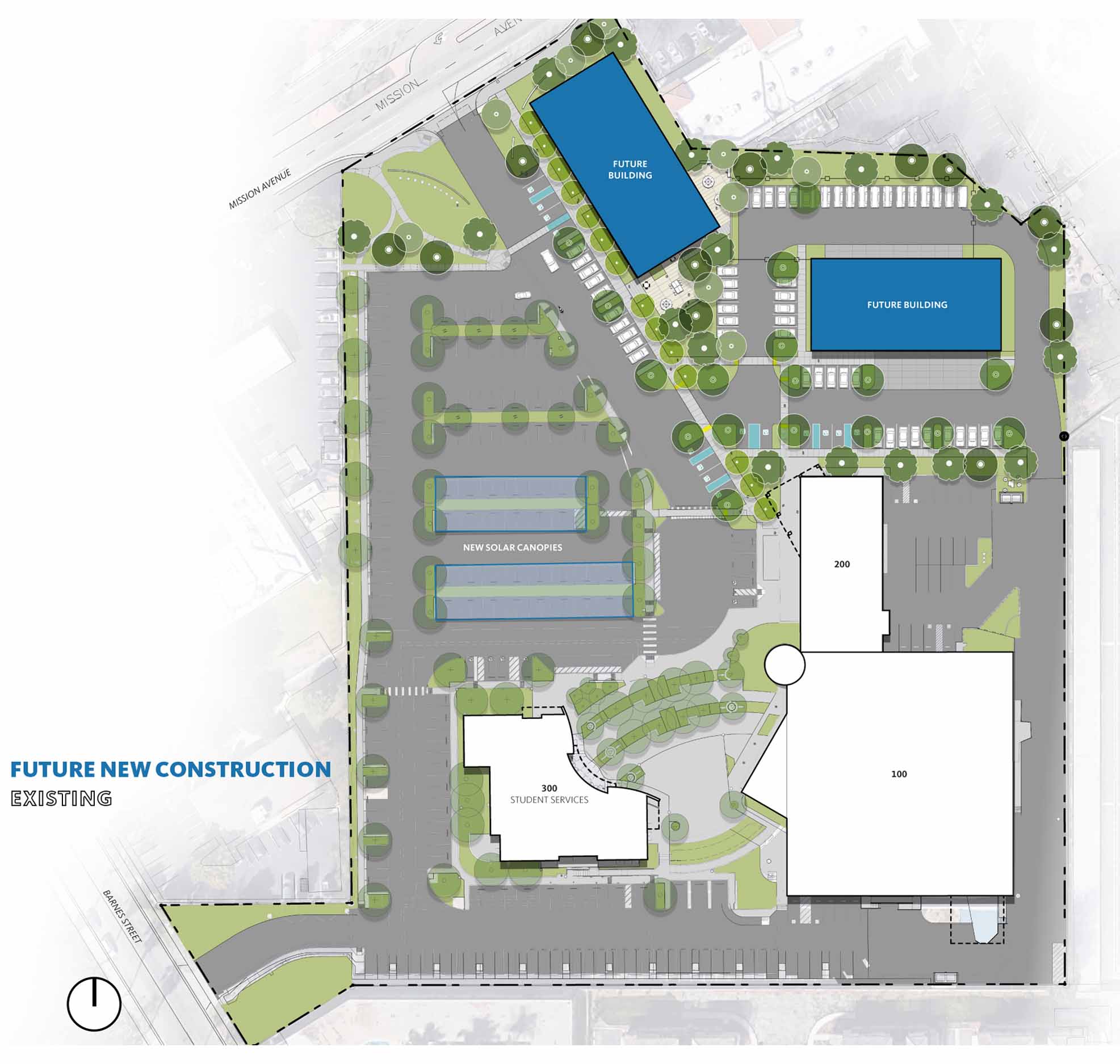 Proposed building footprints continue the development of the CLC with a focus on enhancing the visibility and presence along Mission Avenue, and creating a pedestrian campus experience, with outdoor instruction and collaboration areas.